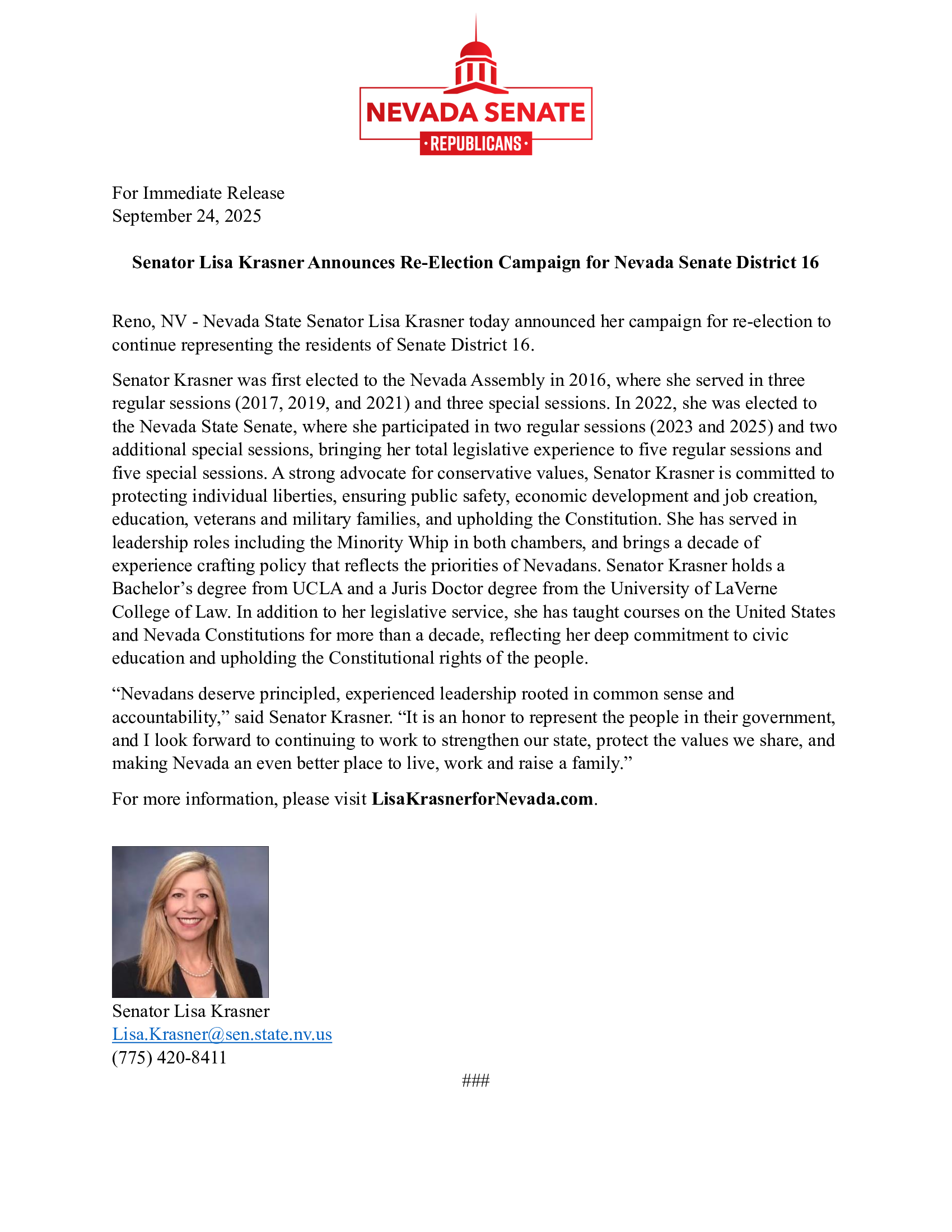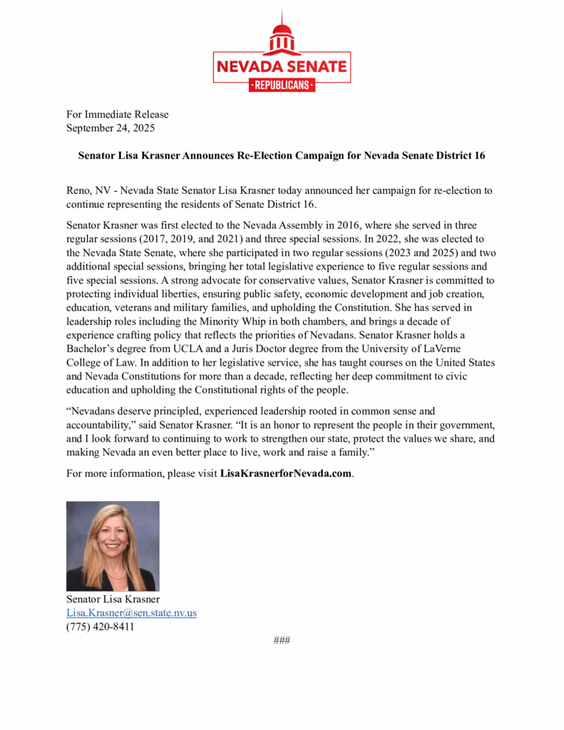 Lisa served as the Senator for NV Senate District 16 in the 2023 NV Legislative Session, as well as in the 34th Special Session and 35th Special Session of the NV Legislature. Lisa also served as the Senator for NV Senate District 16 in the 2025 NV Legislative Session and the 36th NV Special Session. Senator Lisa Krasner is the Incumbent in State Senate District 16.